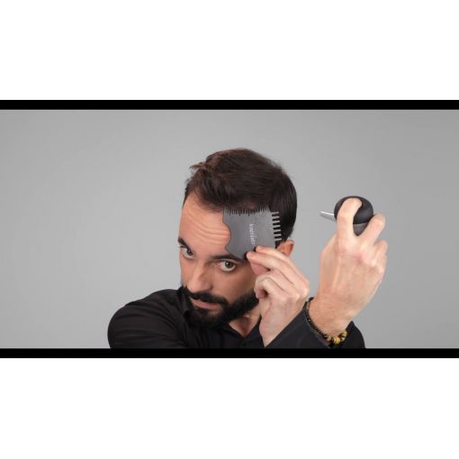 - Breng de Kapilab Keratin Hair Fibers aan over de kam en het haar, zodat wanneer de kam wordt verwijderd, de vezels aan het haar blijven plakken, met als resultaat een perfecte 100% natuurlijke voorste haarlijn.